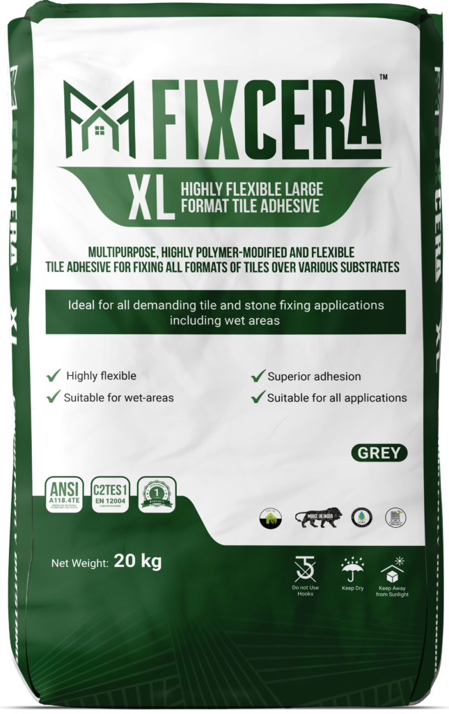 FixCera ™ XL is a cementitious highly polymer modified flexible adhesive specialized for fixing all types of tiles and natural stones over a variety of substrates in interior and exterior areas over floors and walls. It is highly flexible which makes it an ideal choice for large format tiles/ stones and for exterior use.